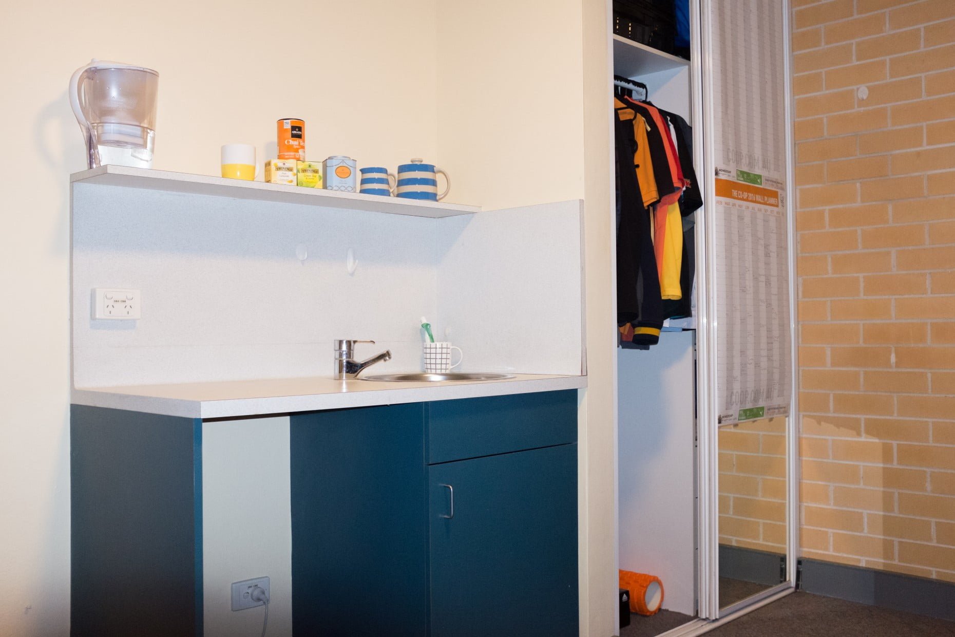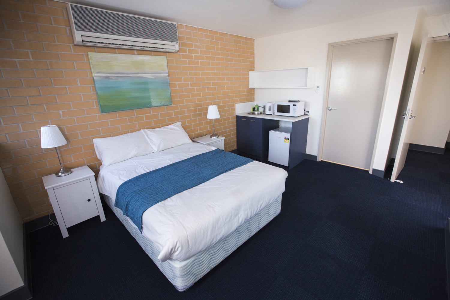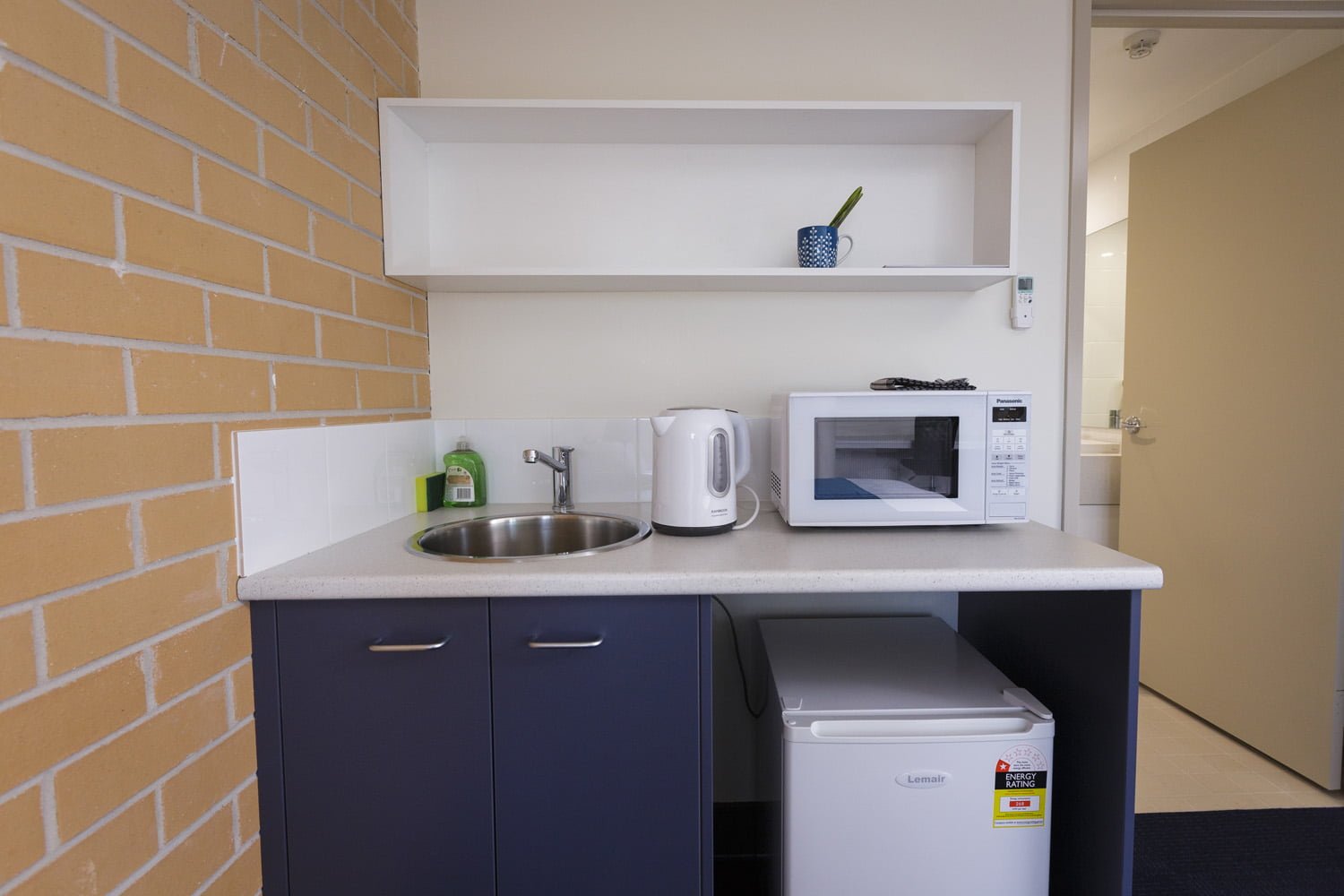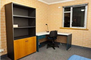 Each has a very large bedroom with double bed and air-conditioning and spacious private bathroom. Features include a built-in mirrored wardrobe with shelves, drawers and hanging space; kitchenette with microwave, mini-fridge, kettle, cutlery and crockery; and large built-in desk with shelves and lighting.