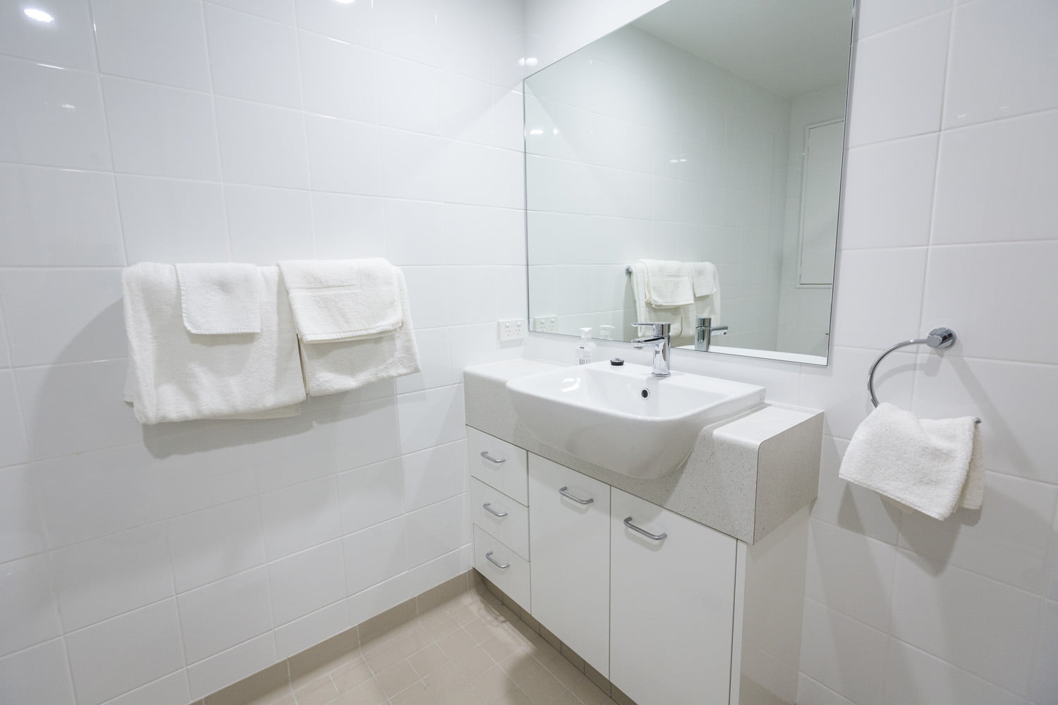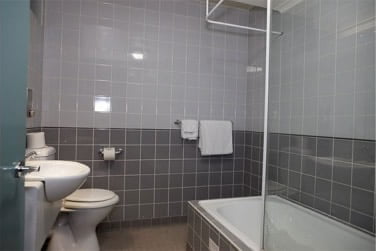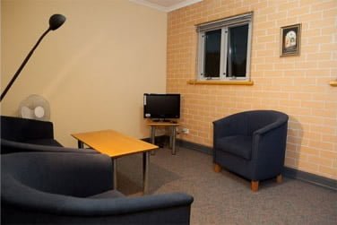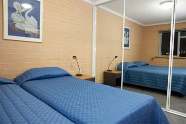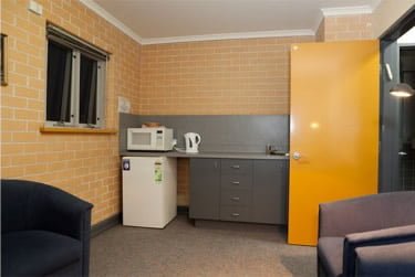 The apartments can be arranged as two single bedrooms or one king bedroom with a large separate study. Each has a private bathroom with bath. Features include a built-in mirrored wardrobe with shelves, drawers and hanging space; lounge area with couch and chairs, television and coffee table; kitchenette including microwave, fridge, kettle, cutlery and crockery; built-in desk, shelves and lighting; and heater and fan.