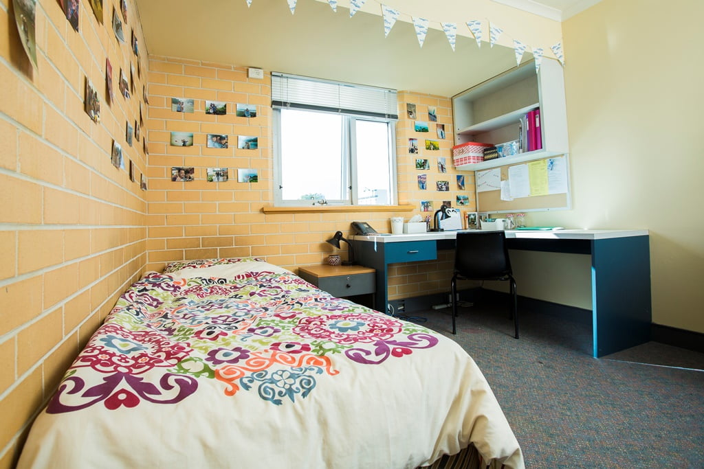 The rooms are all fully furnished with a long single ensemble bed, hand basin, large study desk with lamp, bedside table with lamp, office chair, bookshelf, heater and fan, and built-in mirrored wardrobe with shelves and drawers.